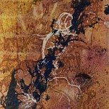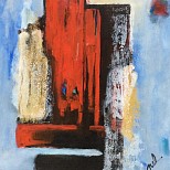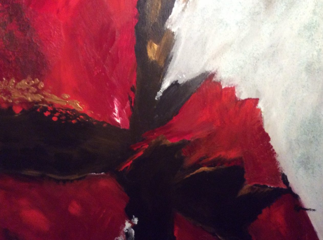 Abstract,in rood en grijs,met goud en structuren,bruin en zwart.diverse lagen acryl opgebracht