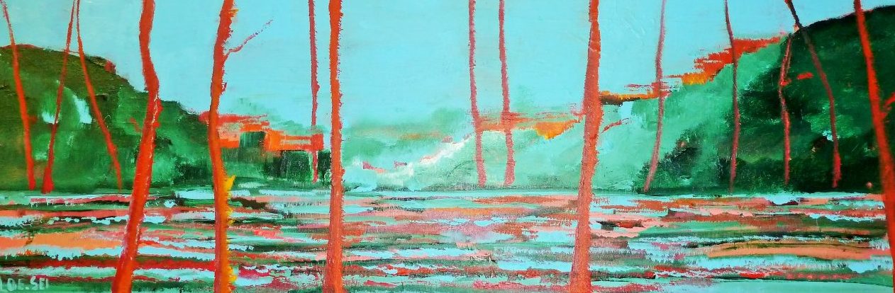 Een globale impressie van het schilderij "Geabstraheerd landschap" 140x40cm.