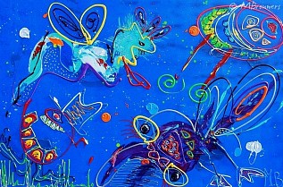 Abstract 3D schilderij waar je met gemak allerlei figuren in kan herkennen. Cartoonesk, sprookjesachtig en karaktervol.