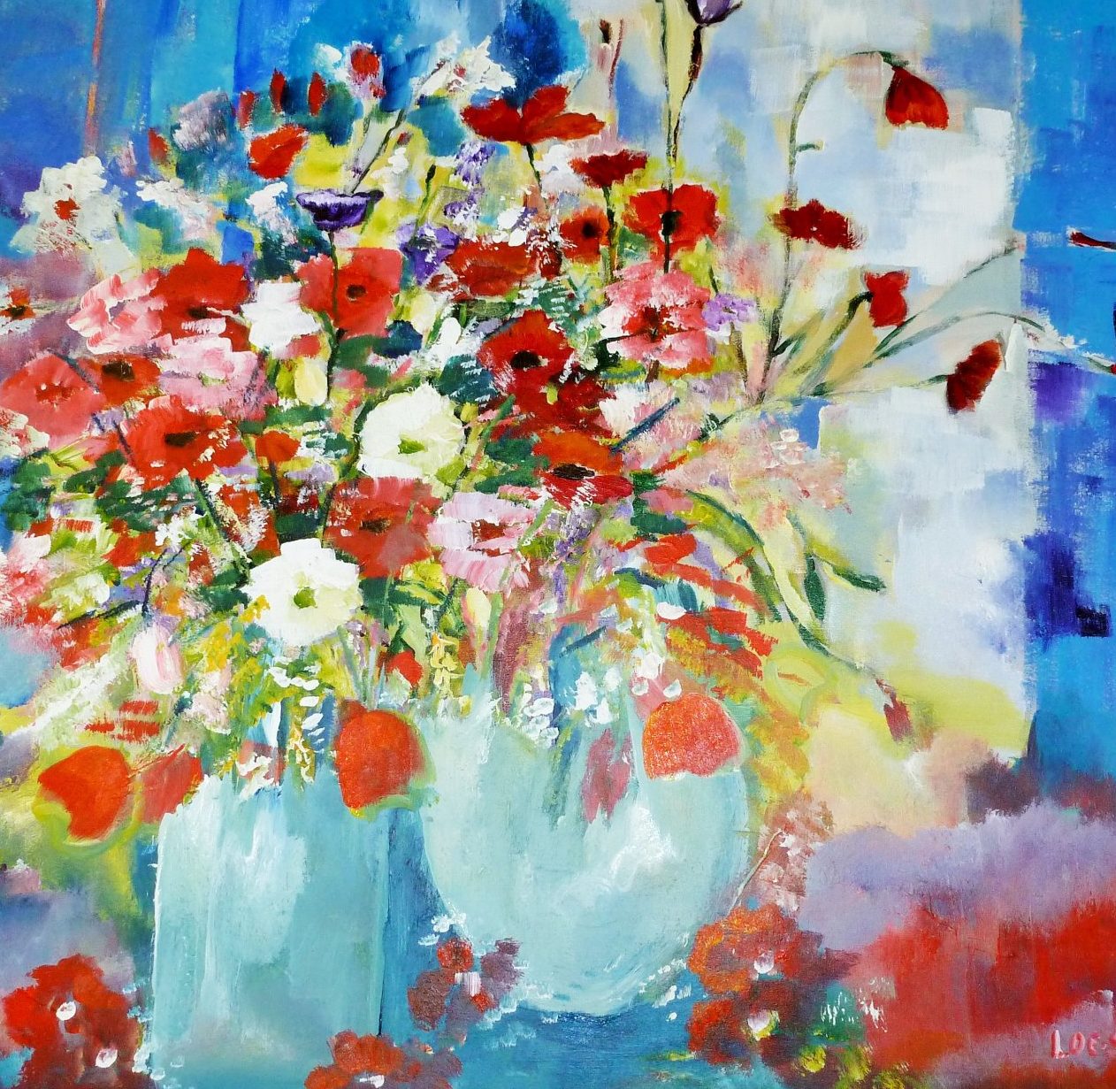 Een globale impressie van het schilderij "Vaas met klaprozen en tulpen" 100x100cm.