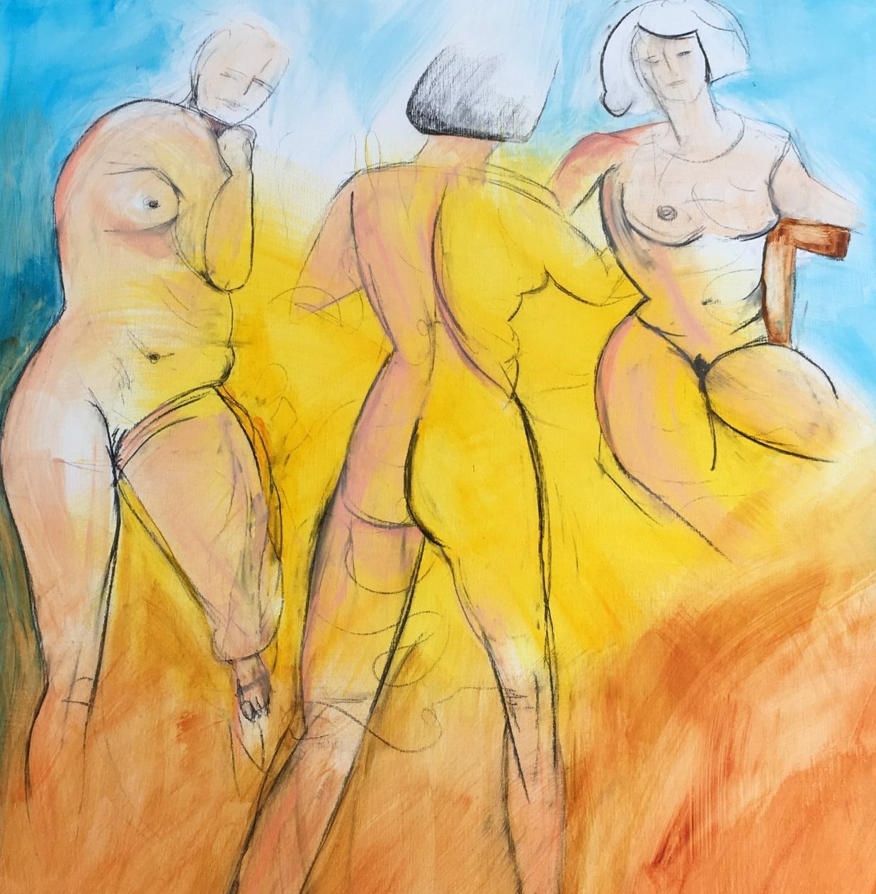 Een globale impressie van het schilderij "Drie gratien" 150x150cm.