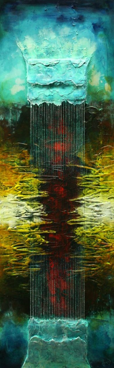 Een globale impressie van het schilderij "Waves of progression" 40x120cm.