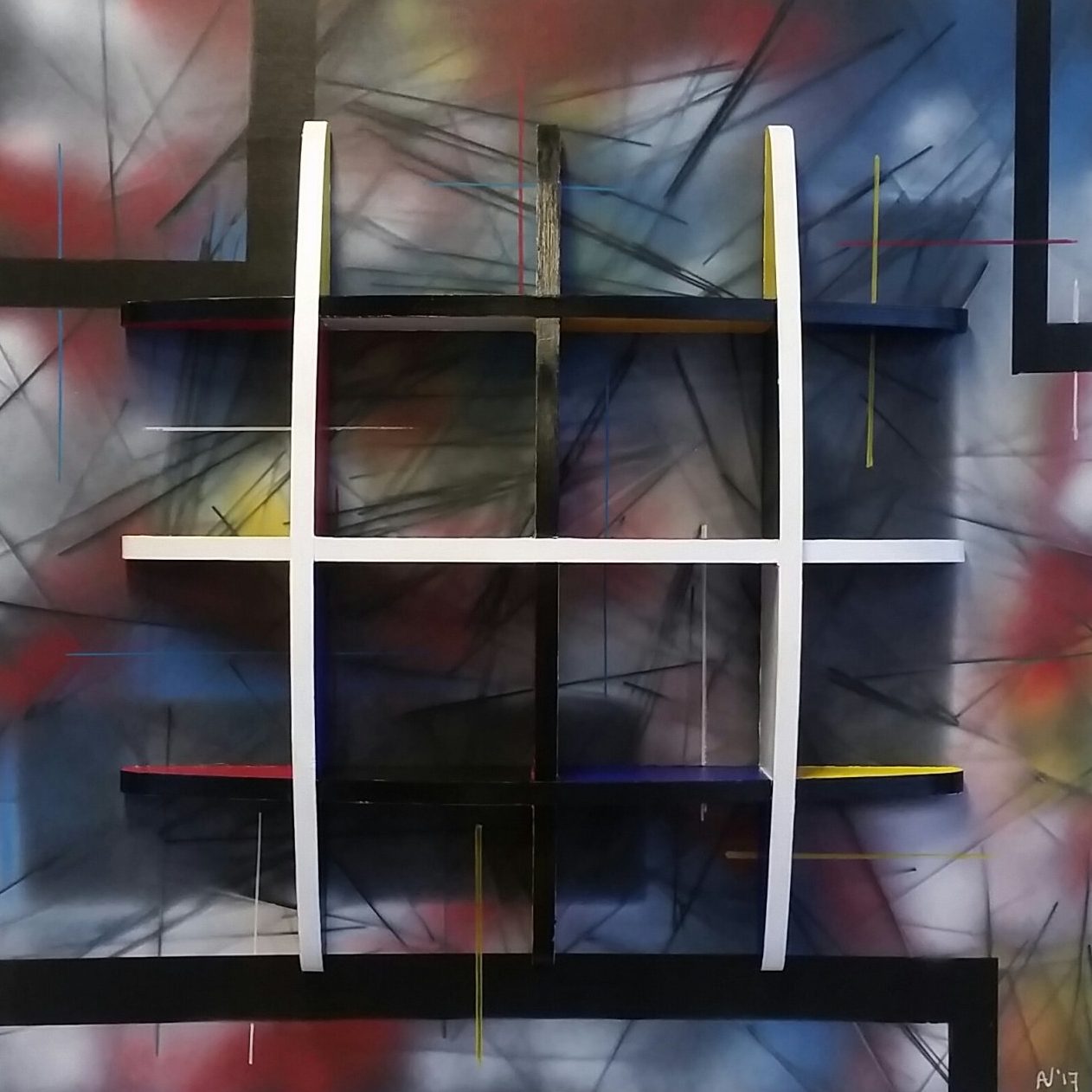 2 keer 3 stuks (zwart en wit) afgerond hout op mdf-plaat, waardoor er 16 vlakken ontstaan op het doek (alle opstaande vlakken hebben de kleuren zwart, wit, rood, geel en blauw). Dit is helaas niet op de foto te zien. Wilt u meer zien, dan kan ik u meer foto's toe sturen. Acrylverf.