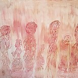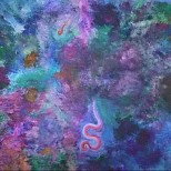 Acrylverf op een groot rechthoekig gevormd doek,. De verf is aangebracht met paletmes en penseel. Zowel penseelstreken als dep techniek toegepast.