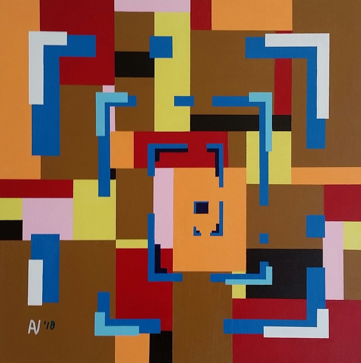 Een globale impressie van het schilderij "S(q)wirl 2 - Alpha searching for Omega" 50x50cm.