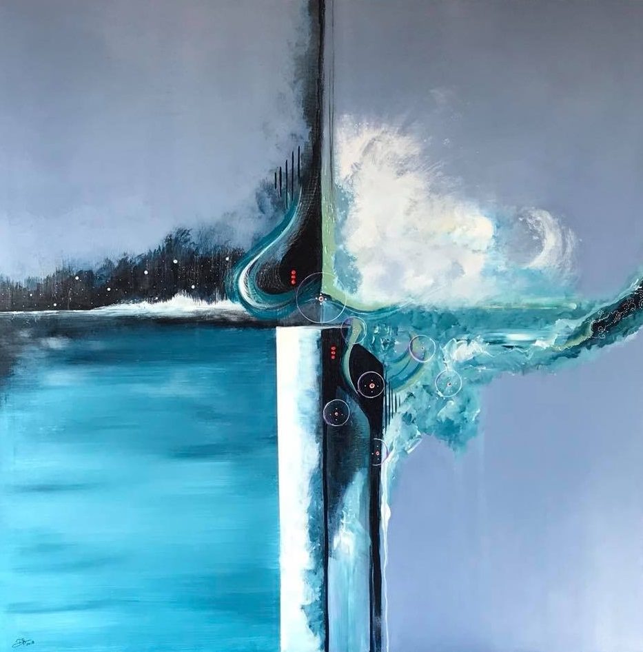 Een globale impressie van het schilderij "Four emotions of life" 100x100cm.