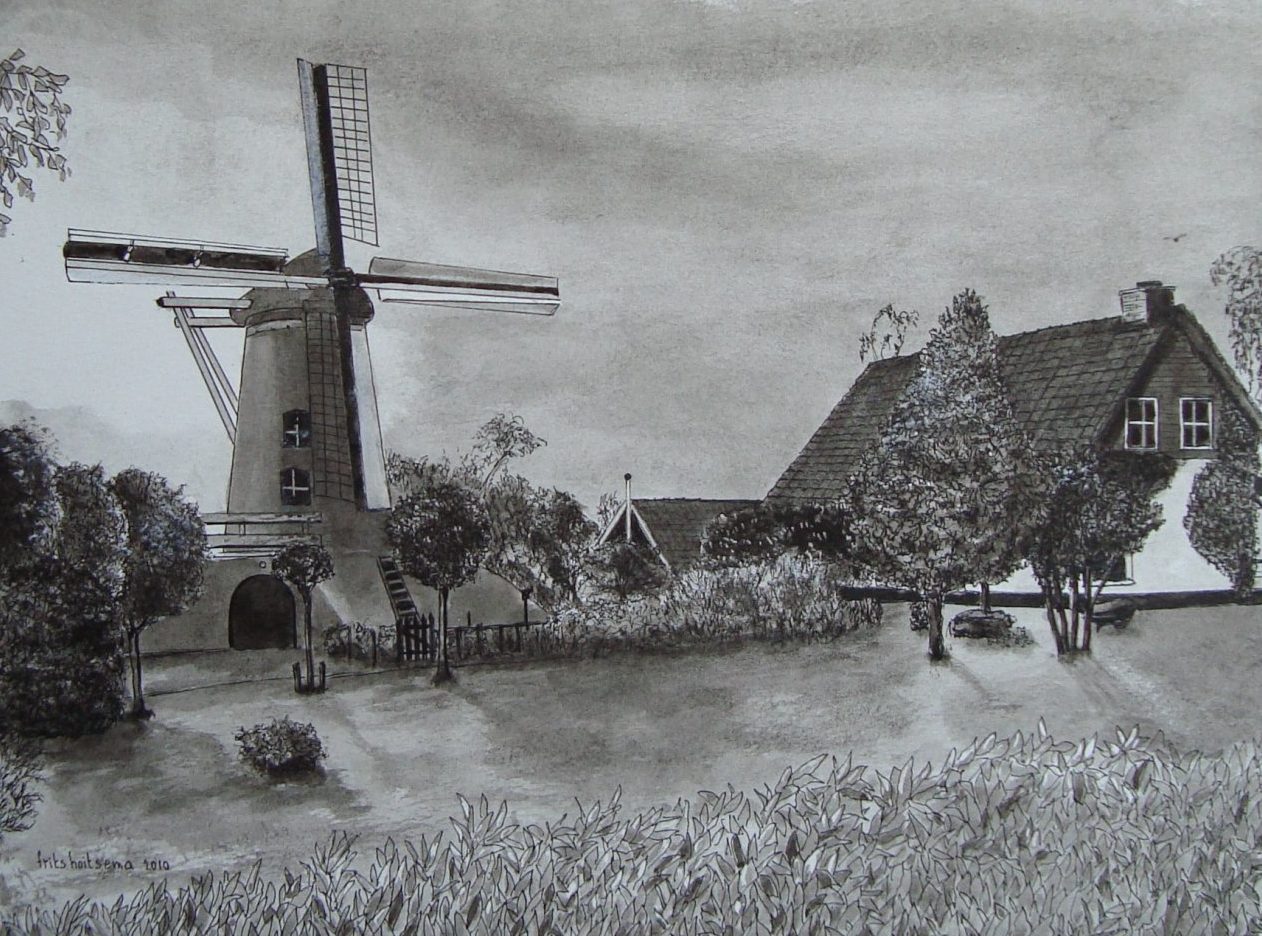 Een globale impressie van het schilderij "Molen te Rha" 50x40cm.