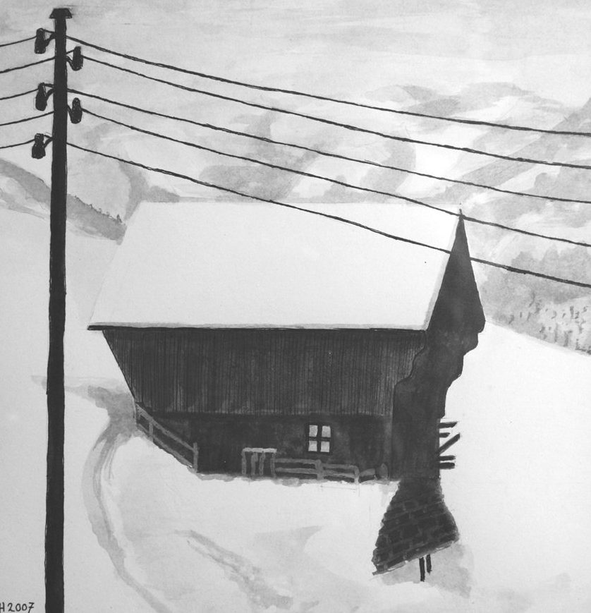 Een globale impressie van het schilderij "Besneeuwde berghut" 40x30cm.