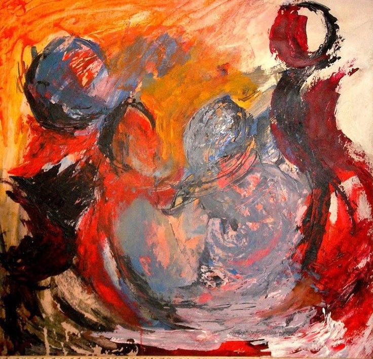 Intuïtief schilderij, kleurig, met paletmes gemaakt en veel beweging.