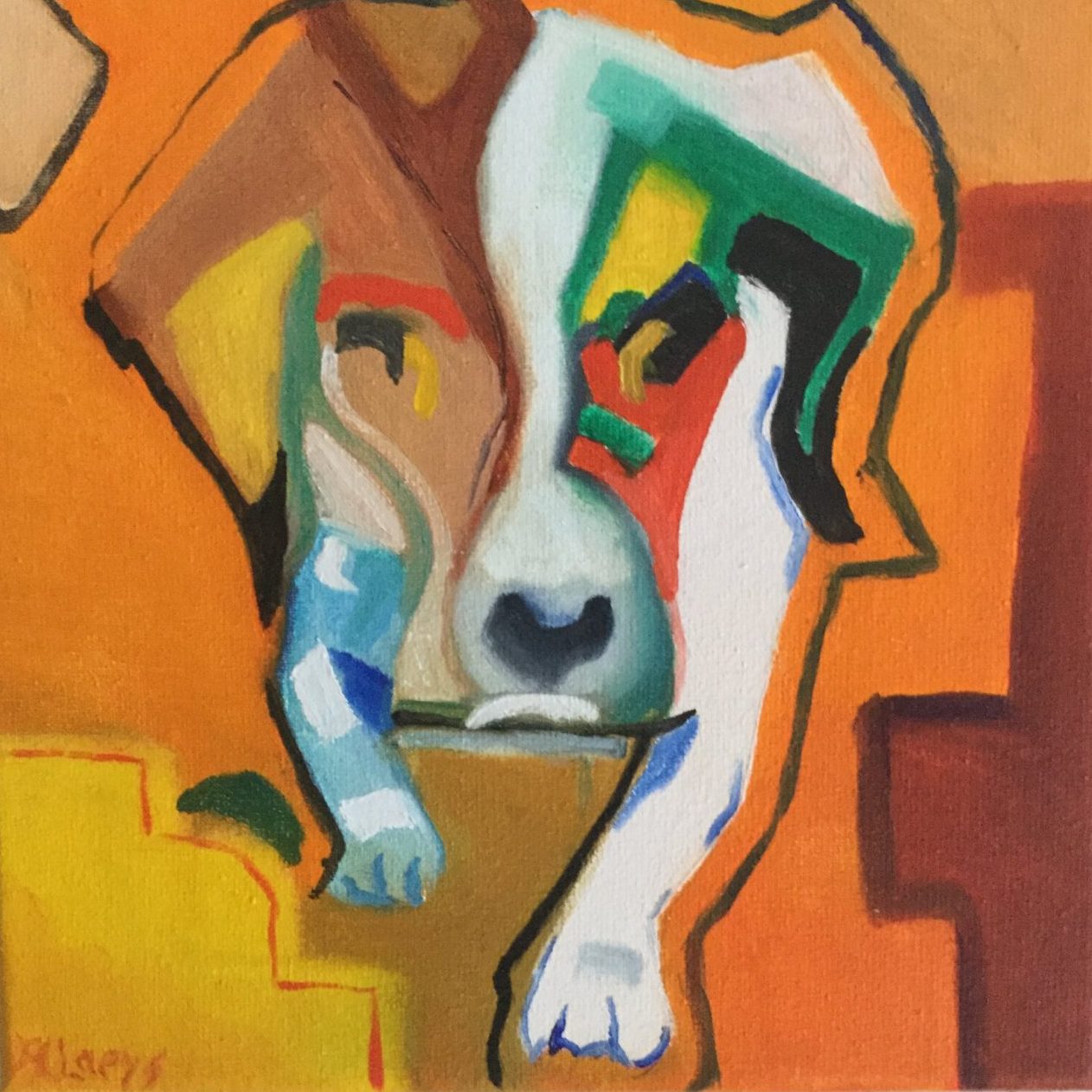 Een globale impressie van het schilderij "Lopend hondje" 20x20cm.