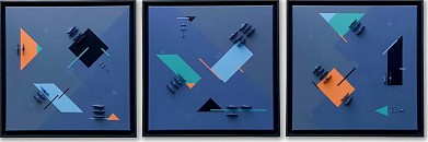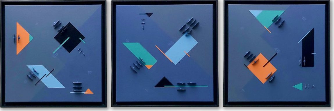 Abstact Artwork. Geometric constructive art. Mixed media. Made with home and handmade woodflakes, some rope, acryl and varnish. Including 3 frames. Formaat als drieluik circa 185x55x8cm (per stuk: 55x55x8xm). Ook los te koop (a 975,00 p.st). Kom gerust eerst kijken in Waddinxveen!