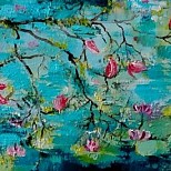 Een globale impressie van het schilderij "Stokrozen" 40x120cm.