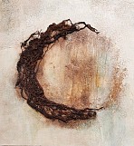 Prachtige roestdraden gemaakt en verwerk als krans op dit doek.