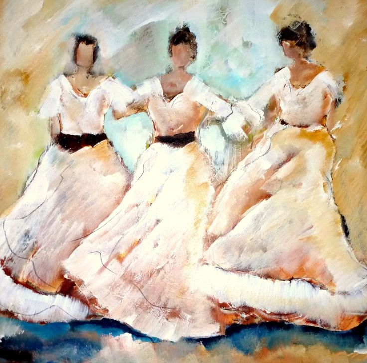 Een globale impressie van het schilderij "Dansende vrouwen" 100x100cm.