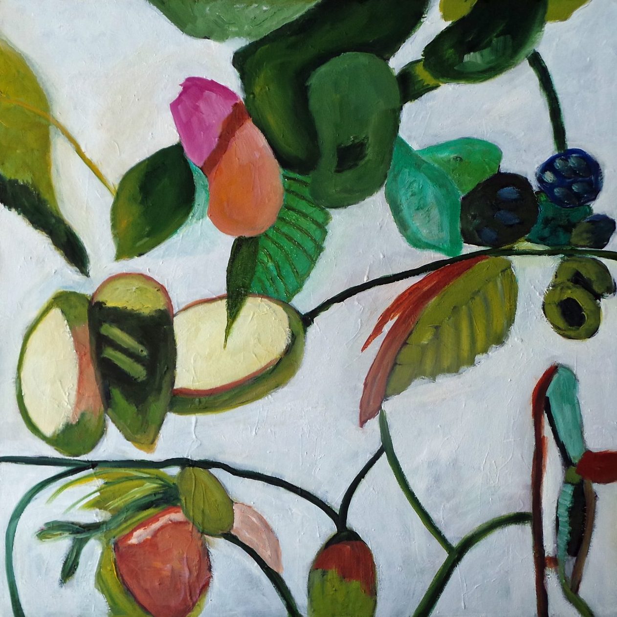 Een globale impressie van het schilderij "2031 Voorjaar in de tuin" 50x50cm.