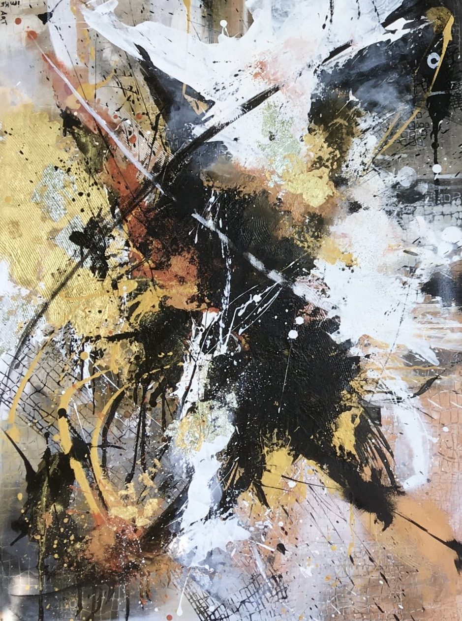 Schilderij sky explosion 3 100x120x3,5 cm. Past zeer goed in een luxe huis/ kantoor inrichting.Mixed media. Acryl op canvas 3 d doek.verwekt met glas korrels, en bladgoud en goud poeder en zwarte baklijst