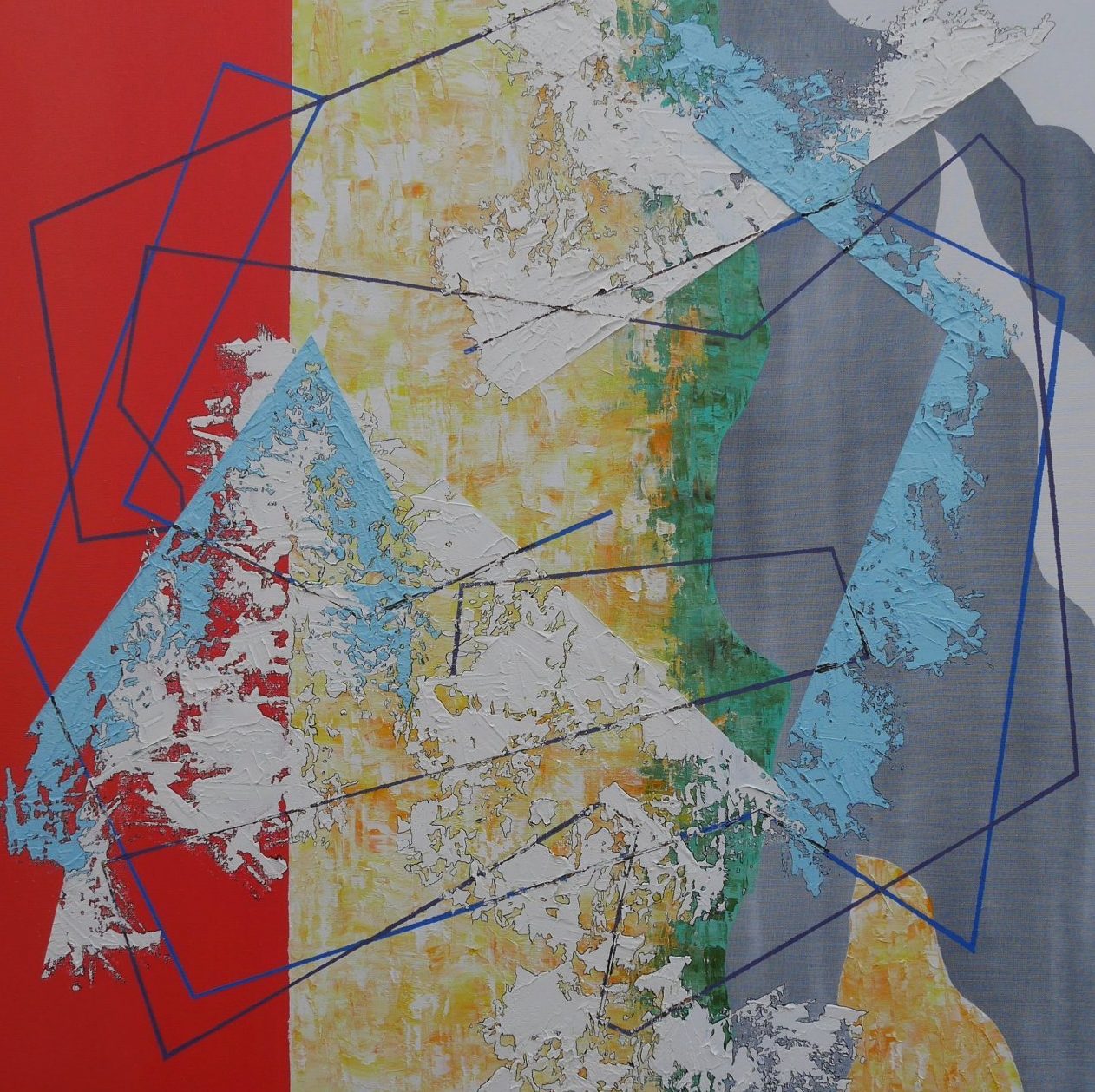 Een globale impressie van het schilderij "LINE-UP (Sixth)" 90x90cm.