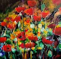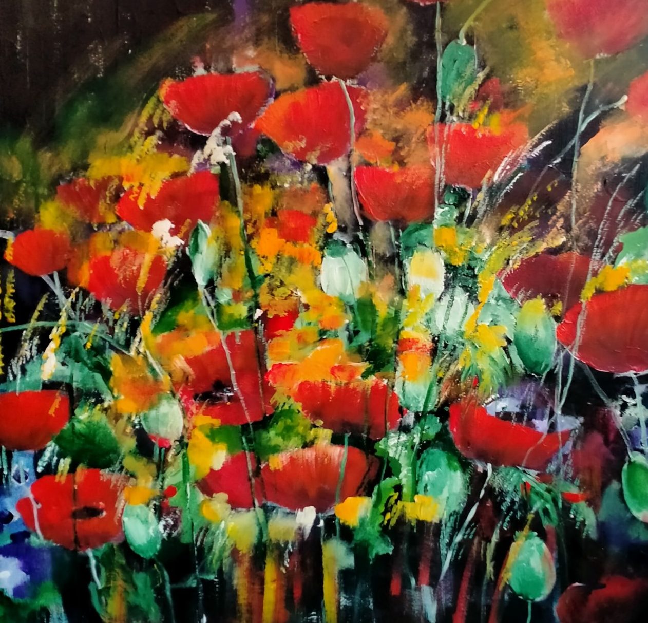 Een globale impressie van het schilderij "Klaprozen" 100x100cm.