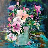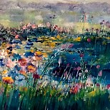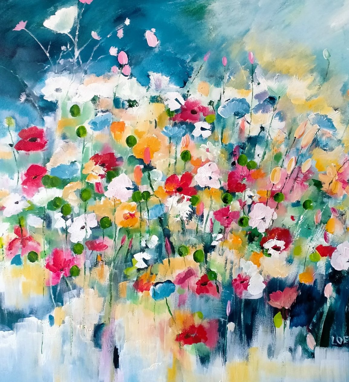 Een globale impressie van het schilderij "Bloemenzee" 100x100cm.