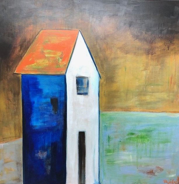 Een globale impressie van het schilderij "House for Sale" 100x100cm.