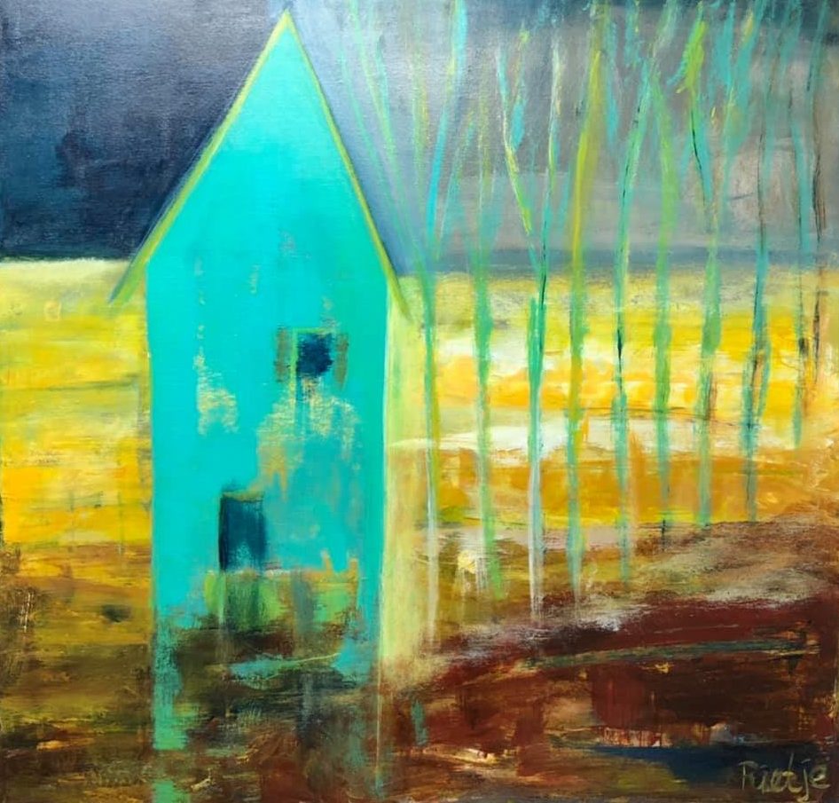 Een globale impressie van het schilderij "Huis aan het begin" 80x90cm.