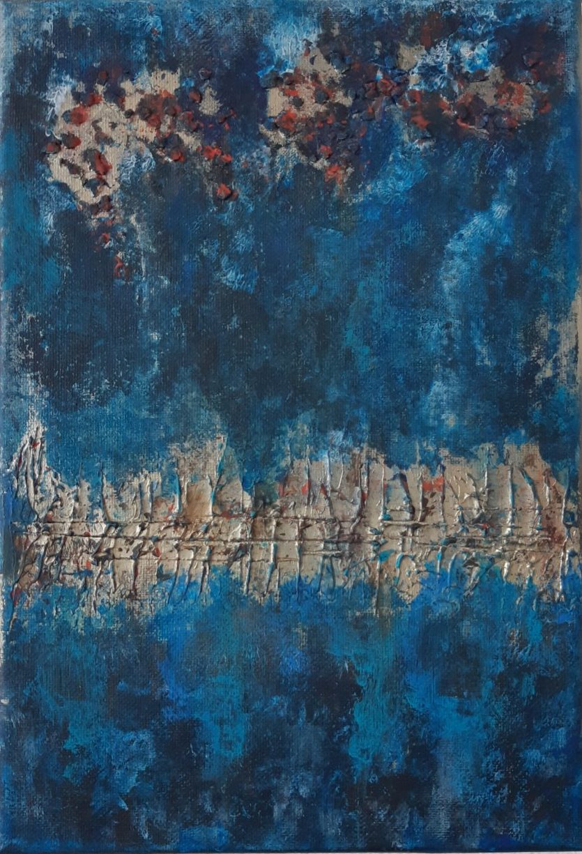 Een globale impressie van het schilderij "Red dots in the sky" 20x30cm.