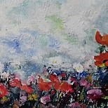 Een globale impressie van het schilderij "Stokrozen" 80x140cm.