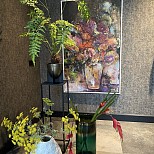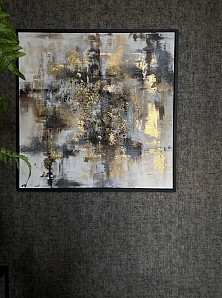 Modern life . Mixed media art. Met goud blad. En gips balletjes. Met zwarte baklijst.afgewerkt met mat vernis. En ophangsysteem. Interesse in dit schilderij? Deze is geëxposeerd in de showroom van Totalhomeconcept in Lelystad.