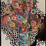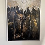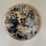 Sky explosion 9. Mixed media . Acryl ,bladgoud en glasparels op rond canvas doek. Afgewerkt met vernis ,incl. Ophangsysteem.