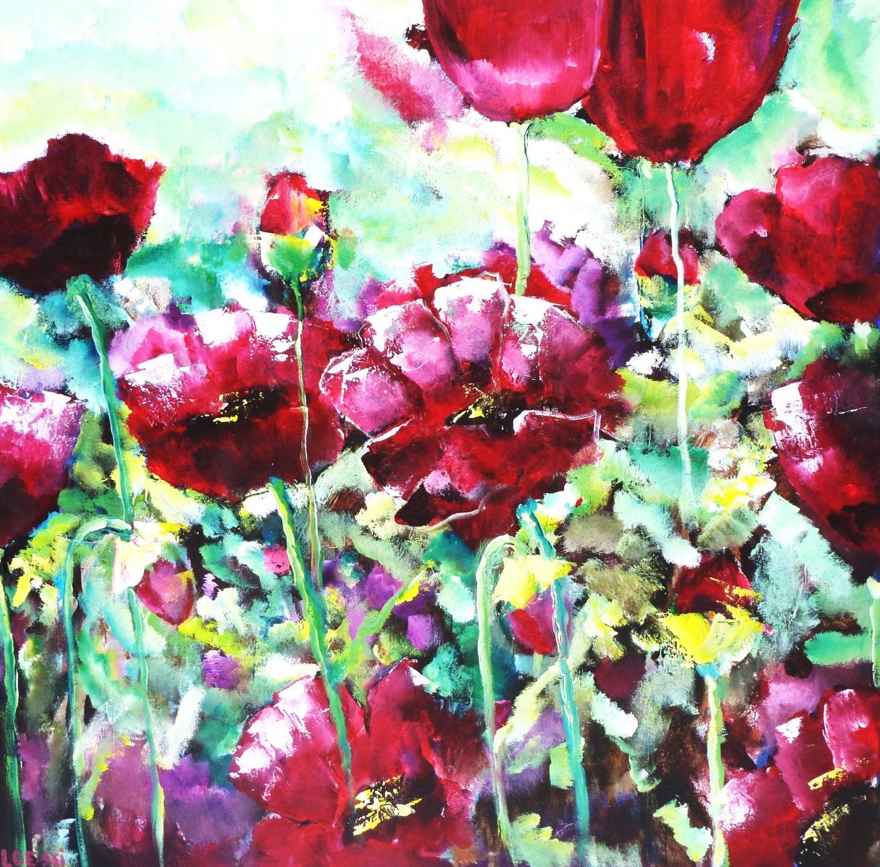 Een globale impressie van het schilderij "Klaprozen" 100x100cm.
